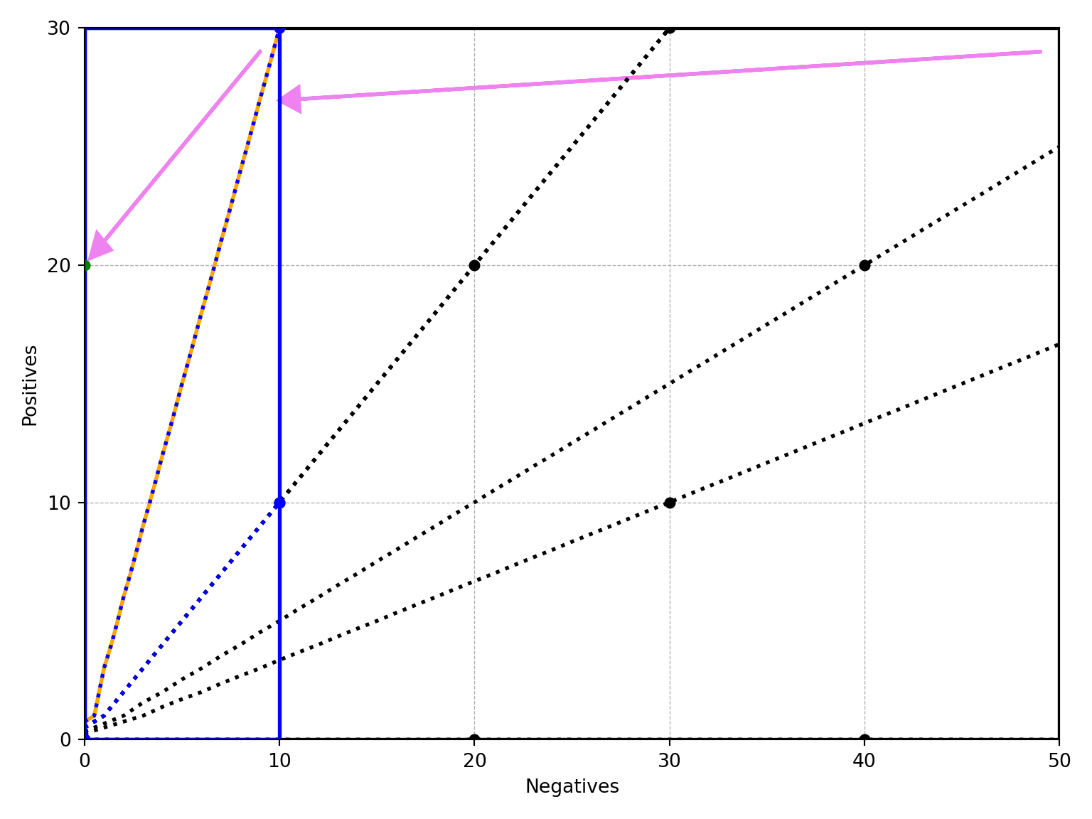 ax.arrow(neg - 1, pos - 1, n - neg + 2, p - pos - 2, head_width=1, head_length=1, fc='violet', ec='violet', linewidth=2)
